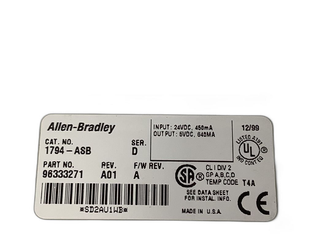 1794-ASB est un adaptateur d'E/S Flex I/O de la série Flex d'Allen Bradley. Ce module est conçu pour connecter des modules d'E/S Flex à un réseau de communication, offrant une solution modulaire flexible et économique pour les systèmes d'automatisation. Le 1794-ASB fonctionne avec une tension d'alimentation de 24V DC et supporte un courant de 640 mA à 55°C. Il est capable de communiquer via le réseau DeviceNet et peut être installé sur un rail DIN ou directement sur un panneau. Avec des indicateurs LED pour le diagnostic et le statut, ce module est adapté aux environnements industriels exigeants, opérant dans une plage de température de 0 à 55°C et une plage de stockage de -40 à 85°C. Le module est conforme aux normes industrielles, incluant UL, C-UL, CE, C-Tick, et est certifié pour les environnements de sécurité intrinsèque (Ex nA et Ex tc). Dans la pratique, le 1794-ASB est idéal pour des applications telles que le contrôle de processus, la manutention de matériaux ou la surveillance de machines, où une configuration d'E/S distribuée est nécessaire. Il assure une intégration aisée et une grande flexibilité pour les modifications de configuration ou les extensions de système.