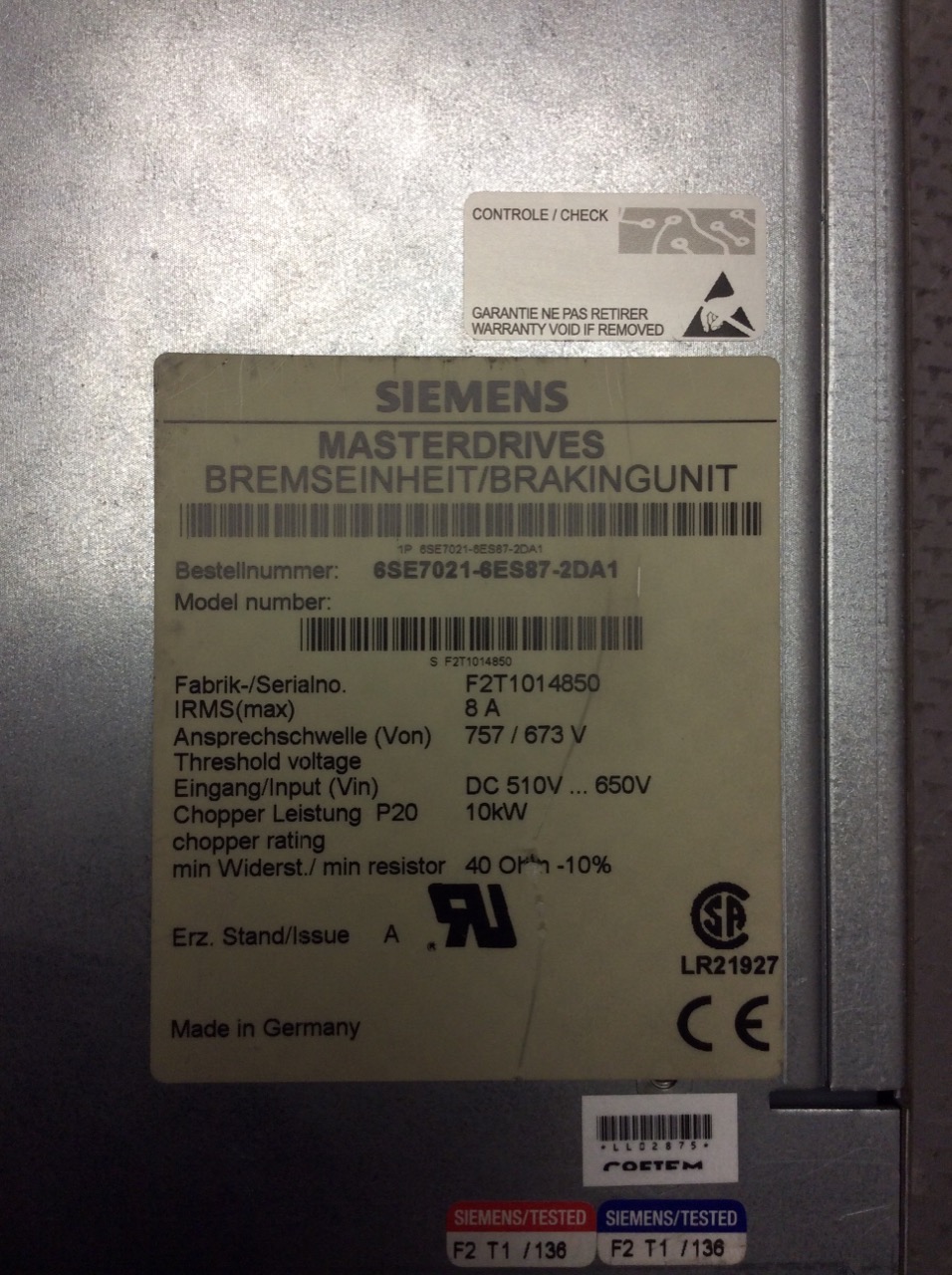 6SE7021-6ES87-2DA1 Module de freinage Simovert Masterdrives Siemens