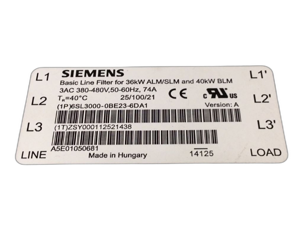 6SL3000-0BE23-6DA1 de la gamme Sinamics S120, de Siemens. Il s'agit d'un filtre de ligne basique adapté aux modules 36 KW Smart Line, 36 KW Active Line et 40 KW Basic Line. Ce filtre est conçu pour une entrée de 3 phases de 380-480V avec une fréquence de 50/60Hz. Ce filtre est utilisé pour améliorer la qualité de l'alimentation électrique en réduisant les interférences électromagnétiques et en filtrant les harmoniques. Il est souvent utilisé dans les applications industrielles telles que les machines-outils, les équipements de manutention, les convoyeurs et les systèmes de production automatisés. En outre, il est souvent associé avec d'autres composants, tels que l’inductance réseau pour le module 36KW Smart Line et les moteurs synchrones de la gamme Simotics pour garantir un fonctionnement optimal des systèmes d'entraînement.