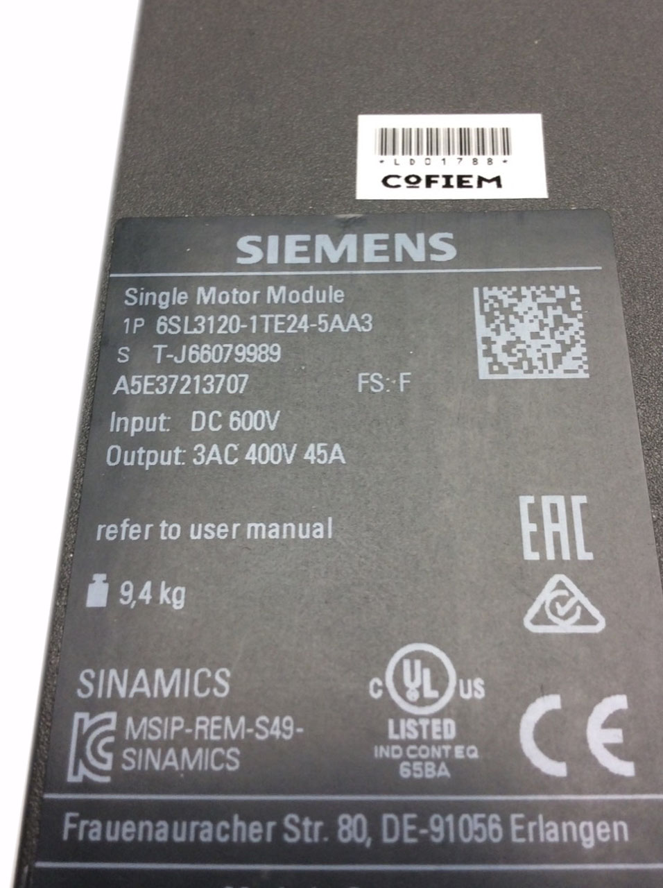 6SL3120-1TE24-5AA3 Module moteur à entrée unique Sinamics Siemens