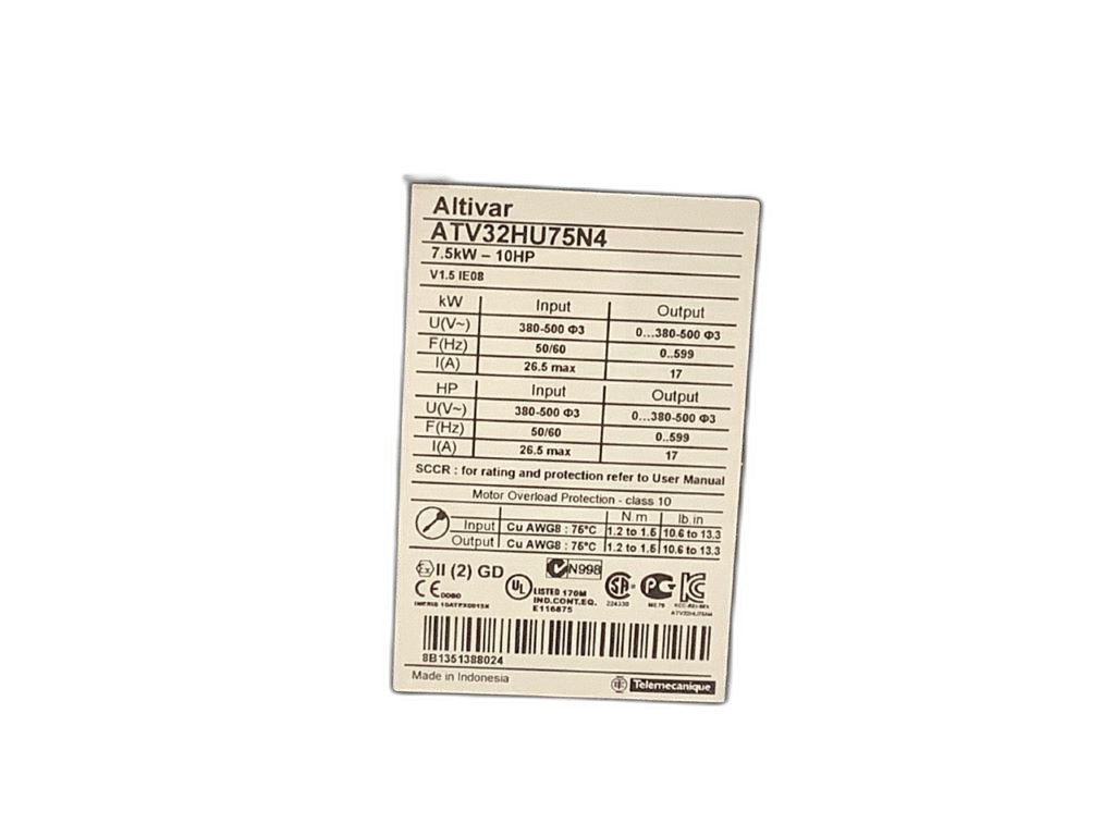 de ce variateur de vitesse est ATV32HU75N4. Il Altivar 32 Telemecanique Schneider Electric. Ce variateur de vitesse a une tension d'alimentation de 380 à 500 V avec une fréquence de 50 à 60 Hz. Il a une puissance moteur de 7,5 kW à 380 à 480 V et une gamme de vitesse de 1 à 100 pour moteur asynchrone en mode boucle ouverte. Il est destiné à être utilisé avec des moteurs asynchrones ou synchrones et peut être appliqué dans des machines complexes. Exemples d'applications industrielles : contrôle de vitesse et de couple dans les moteurs industriels, automatisation des processus de production, contrôle de la vitesse des convoyeurs et des machines-outils, etc.