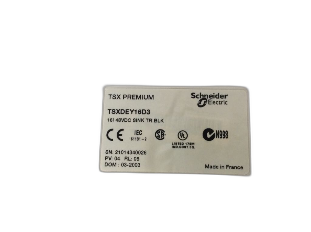 TSXDEY16D3 de la gamme Modicon Premium de Schneider Electric. Ce module d'entrées numériques est spécialement conçu pour gérer 16 entrées de type tout ou rien (TOR) avec une tension d'entrée de 48 V CC positif. Il est compatible avec des détecteurs de proximité à 2 ou 3 fils, conformément à la norme EN/CEI 60947-5-2. Chaque entrée TOR a une consommation de courant de 7 mA, et le module assure une tension d'état 1 supérieure ou égale à 30 V avec un courant d'état 1 supérieur ou égal à 6,5 mA. Pour l'état 0, la tension est inférieure ou égale à 10 V avec un courant inférieur ou égale à 2 mA. L'impédance d'entrée est de 7000 Ohm à phase 1, et le temps de réponse est inférieur ou égal à 7 ms, avec une précision de 4 ms. Le module dispose d'un bornier à vis pour le raccordement électrique et est marqué CE. Sa consommation électrique est de 135 mA à 24 V CC et de 80 mA à 5 V CC. Le produit est conforme à la norme CSA C22.2 No 213 Classe I Division 2 Groupes A, B, C, D, UL 508, EN/CEI 61131-2, ainsi qu'aux directives européennes 73/23/EEC, 93/68/EEC, 92/31/EEC, et 89/336/EEC. Il est également certifié par des organismes maritimes tels que DNV, GL, RINA, BV, LR, ABS, et RMRS. Le module TSXDEY16D3 résiste à une tension diélectrique de 1500 V CA à 50/60 Hz et peut opérer dans des conditions de 0 à 60 °C avec une humidité relative de 10 à 95 % sans condensation. Il est adapté à une utilisation jusqu'à une altitude de 2000 m et bénéficie d'un traitement de protection TC avec un degré de protection IP20.