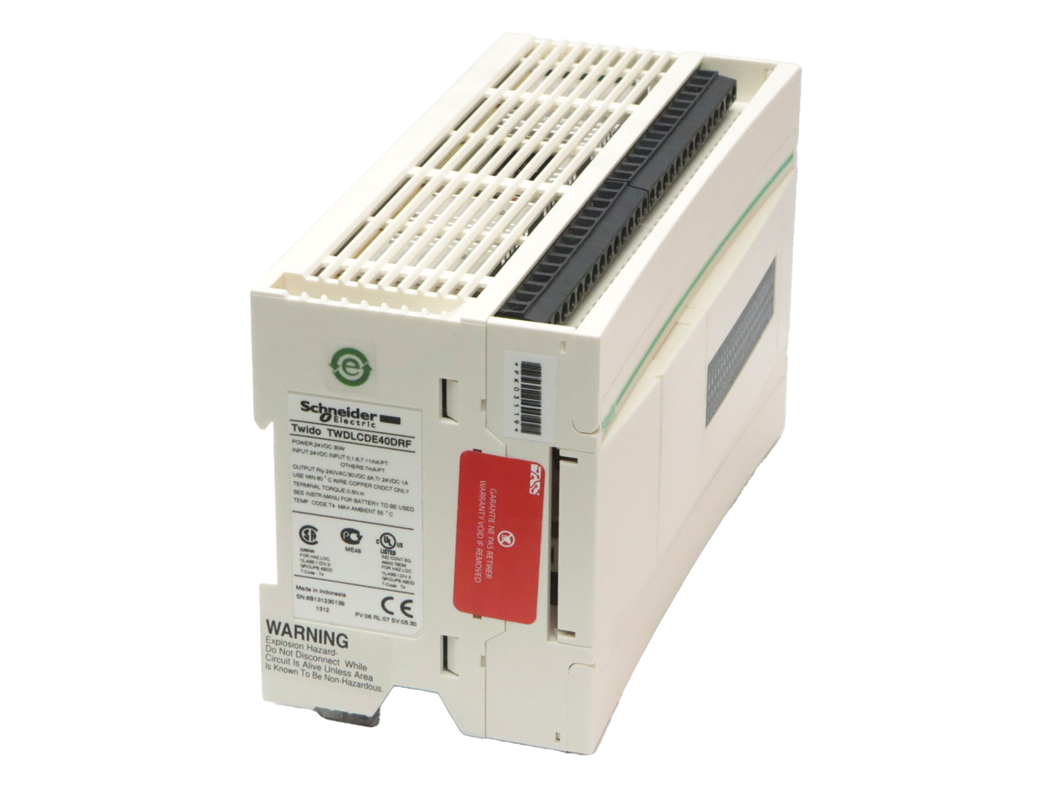 TWDLCDE40DRF Base d'automate extensible Twido Schneider Telemecanique 24 VCC 24 entrées 24E numériques 24 VCC 16 sorties 16S relais jusqu'à 40 E/S supplémentaires port RS-485 110 x 90 x 40 mm