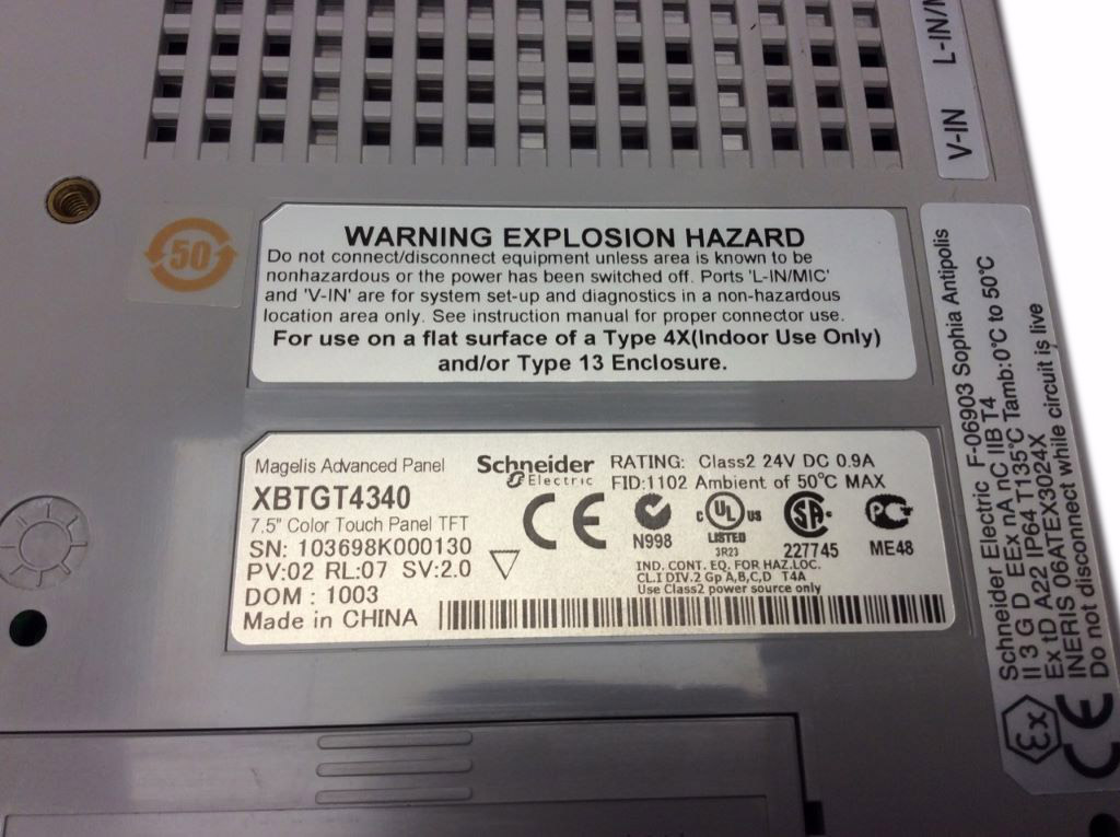 Le terminal de dialogue avancé Magelis XBT GT XBTGT4340 est un produit de la gamme Harmony XBTGT. Ce terminal tactile avancé est doté d'un écran LCD TFT rétro-éclairé de 7,5 pouces, offrant une résolution de 640 x 480 pixels VGA et capable d'afficher 65536 couleurs. Il est équipé d'un processeur CPU RISC avec une fréquence de 266 MHz et dispose de 512 Ko de mémoire SRAM pour la sauvegarde des données, ainsi que de 32 Mo de mémoire flash EPROM pour l'application. En termes de connectivité, le XBTGT4340 propose une variété d'options, y compris un connecteur RJ45 pour liaison série COM2 avec interface RS485 à une vitesse maximale de 187,5 kbit/s, un connecteur SUB-D 9 mâle pour liaison série COM1 avec interface RS232C/RS422/RS485 jusqu'à 115,2 kbit/s, et un port Ethernet TCP/IP via un connecteur RJ45. Il dispose également d'un port USB type A, d'entrées/sorties numériques et audio, ainsi que d'une entrée vidéo combinée RCA (NTSC/PAL). La tension d'alimentation requise est de 24 V CC, avec une plage de tension admissible de 19,2 à 28,8 V. La consommation de puissance est de 28 W, et le terminal est équipé d'une LED pour l'indication de l'opération normale ou des défauts. Le XBTGT4340 est conforme à la norme EN 61131-2 et dispose de certifications telles que UL Class 1 Division 2 T5, ATEX zone 2/22, offrant une protection IP65 sur la face avant et IP20 à l'arrière, et est conçu pour fonctionner dans des températures allant de 0 à 50 °C.
