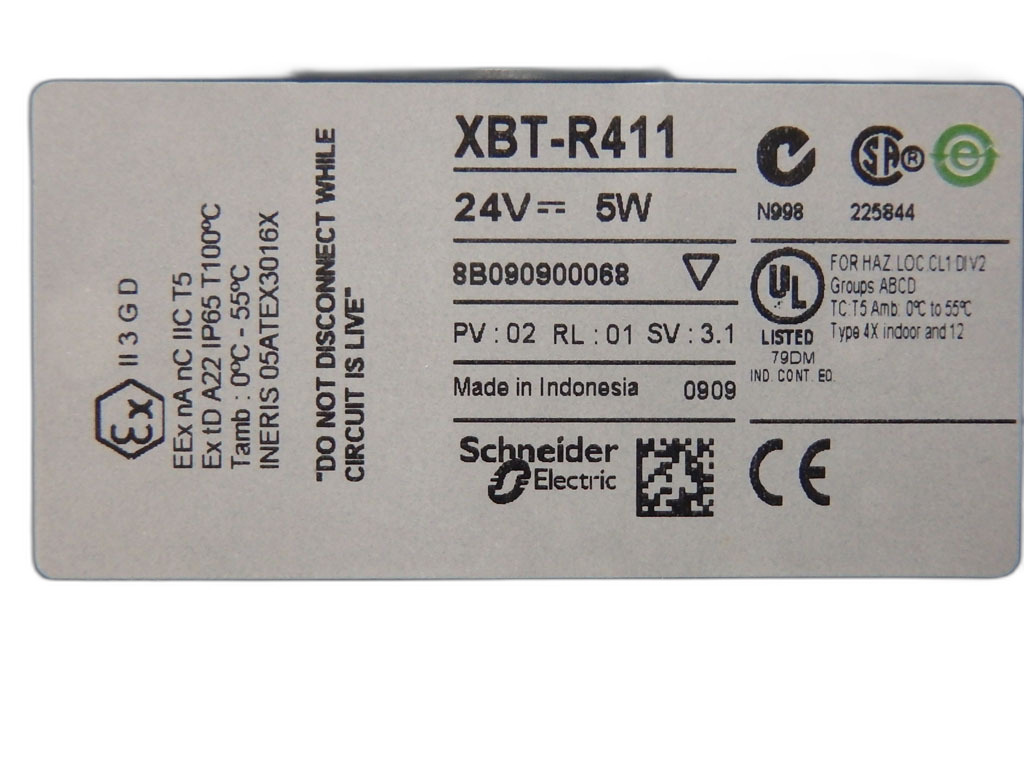 XBTR411 de la gamme Magelis XBT N/R/RT de Schneider Electric. Ce terminal est doté d'un écran LCD matriciel rétro-éclairé avec une résolution de 122x32 pixels. Il fonctionne sous une tension d'alimentation de 24 V CC, acceptant des variations de 18 à 30 V et une ondulation résiduelle jusqu'à 1200 mV. Sa consommation de puissance ne dépasse pas 5 W. Le terminal est équipé de 20 touches, dont 8 fixes et 12 personnalisables, et de 16 LEDs pour l'indication de tension. Il peut contenir jusqu'à 200 pages d'application et 256 pages d'alarme, avec une mémoire Flash de 512 Ko. Pour la connectivité, il dispose d'une liaison série (RS232C/RS485) via un port SUB-D 25 femelle, une alimentation par bornier débrochable à vis, et un port d'imprimante mini DIN femelle. Le XBTR411 est compatible avec diverses gammes d'automates, y compris Modicon Premium, Modicon M340, Twido, Modicon TSX Micro, Modicon Momentum et Modicon Quantum. Son installation se fait par montage encastré avec fixation par clips à ressort. Concernant les normes, le terminal est conforme aux exigences de la CEI 61131-2, CEI 60068-2-6, CSA C22.2 No 14, CEI 60068-2-27 et UL 508. Il est également certifié pour des environnements spécifiques comme CSA Class 1 Division 2, UL 1604, ATEX zone 2/22 et UL Class 1 Division 2.