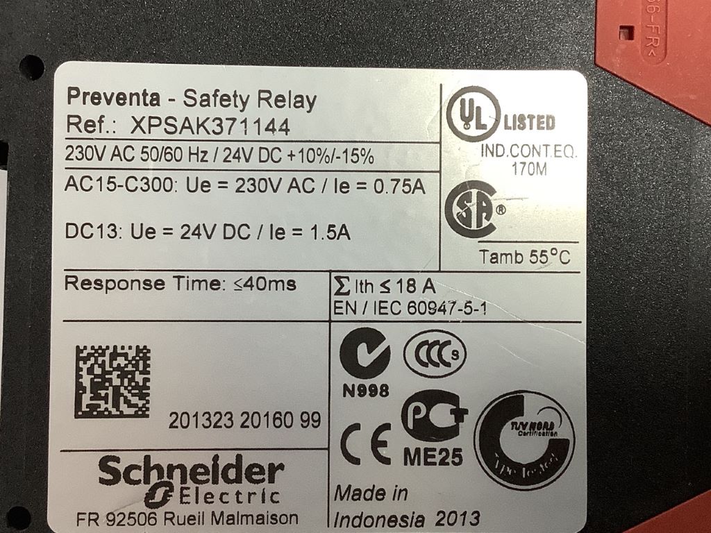 Le module de sécurité Preventa XPSAK371144 est un élément essentiel pour la surveillance de circuits d'arrêt d'urgence et d'autres dispositifs de sécurité. Il de la gamme Preventa, conçu pour des applications telles que le contrôle d'arrêts d'urgence, de tapis de détection, de bords sensibles et de barrières immatérielles de sécurité. Ce module fonctionne avec une tension d'alimentation de 230 V CA avec une tolérance de -15 à +10 % ou 24 V CC avec la même tolérance, et sa consommation maximale est de 6 VA en CA. Il offre une fréquence d'alimentation de 50/60 Hz et permet divers types de connexions grâce à des borniers à vis-étrier captives pour des câbles de 0,14 à 2,5 mm². En matière de sécurité, le module atteint un niveau de performance PL e/Catégorie 4 selon la norme EN/ISO 13849-1 et un niveau de sécurité SILCL3 selon les normes EN/IEC 61508 et EN/IEC 62061. Il se distingue par une fiabilité élevée avec un DC (Diagnostic Coverage) supérieur à 99 % et un MTTFd (Mean Time To Failure dangerous) de 154,5 ans. Le XPSAK371144 est conforme à des normes de sécurité et de contrôle industriel, y compris EN/ISO 13850, EN/CEI 60947-5-1, EN 1088/ISO 14119, et EN/CEI 60204-1, et bénéficie de certifications CSA, UL et TÜV. Le XPSAK371144 est parfait pour la surveillance électrique d’interrupteurs activés par des dispositifs de protection, la surveillance de tapis et bords de sécurité à 4 câbles, ainsi que la surveillance de barrières immatérielles de type 4 avec sorties de relais de sécurité statiques.