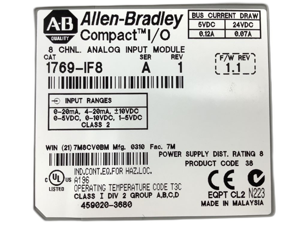 La carte d'entrée sortie analogique ALLEN BRADLEY 1769-IF8 est un module de la gamme ControlLogix, conçu pour offrir une solution efficace et fiable pour les systèmes d'automatisation industrielle. Ce module possède des entrées/valeurs analogiques avec une précision de conversion élevée, capable de détecter des variations minimales, ce qui le rend idéal pour des applications de mesure précise et de contrôle de processus. Le 1769-IF8 supporte les environnements industriels difficiles grâce à sa certification pour les locations dangereuses (Class I, Division 2) et son isolation électrique renforcée testée à 1500V AC pour une durée de 60 secondes . De plus, avec une garantie de 24 mois, chaque unité reconditionnée répond aux standards élevés de Cofiem et vient avec le label RECQ, assurant qualité et durabilité. Pour plus d'informations ou pour l'acquisition de ce module spécifique, n'hésitez pas à contacter Cofiem pour des solutions en matière de matériel obsolète reconditionné.