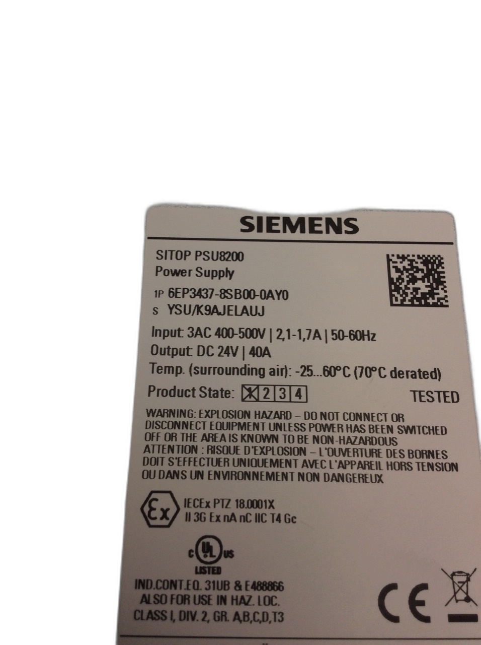 6EP3437-8SB00-0AY0 est une alimentation stabilisée de la gamme Sitop PSU8200, conçue par Siemens. Cette unité d'alimentation fournit une tension de sortie DC de 24 V et une capacité de courant de 40 A, fonctionnant avec une tension d'entrée triphasée de 3 AC 400-500 V. La gamme Sitop PSU8200 est réputée pour sa robustesse et sa fiabilité, offrant une alimentation continue et stable même en cas de perturbations électriques, ce qui est essentiel pour la continuité de la production industrielle. Les produits Siemens, y compris cette alimentation, respectent généralement les normes internationales comme CE et UL, garantissant leur conformité et leur qualité. La gamme Sitop est couramment employée dans de nombreuses applications industrielles pour alimenter des contrôleurs, des capteurs et des actionneurs, assurant ainsi le bon fonctionnement des processus automatisés.