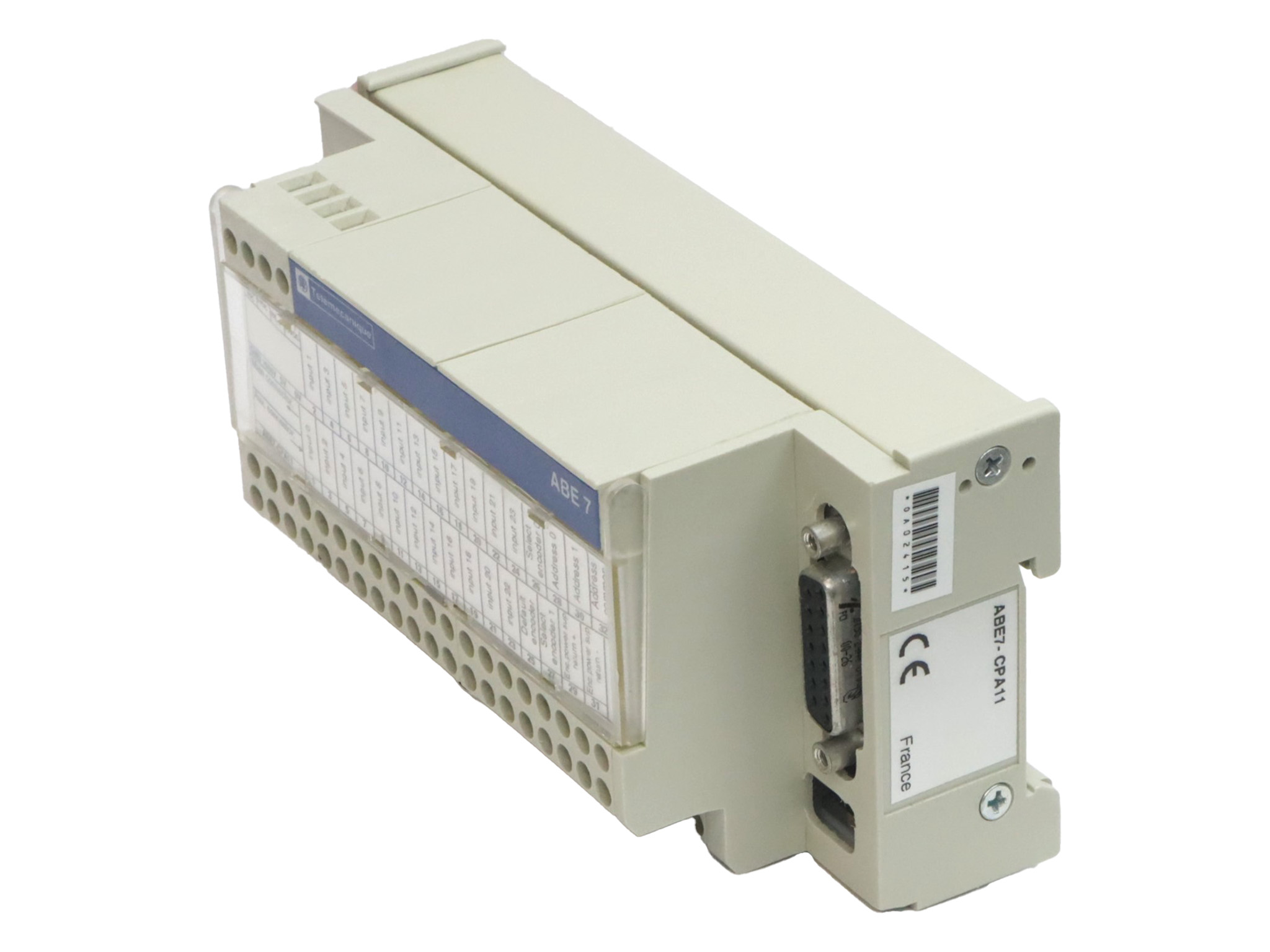 ABE7CPA11 de la gamme Advantys Telefast ABE 7. C'est une embase de raccordement adaptée aux applications de comptage et aux voies analogiques, conçue spécifiquement pour la connexion d'un codeur absolu avec sortie parallèle. Elle est compatible avec les automates de la série Premium, incluant les modèles TSXCAY21, TSXCAY41, TSXCTY2A et TSXCTY4A. Sur le plan technique, l'embase ABE7CPA11 est conçue pour fonctionner avec une tension de circuit de commande de 24 V CC ou de 5 V CC. Elle est équipée d'un seul canal et se connecte via un port SUB-D 15. Les bornes de type vis sont adaptées pour des câbles de 0,09 à 2,5 mm², offrant des options pour des câbles souples avec ou sans embout et des câbles rigides. La tension assignée d'isolement est de 2000 V entre les bornes et les rails de montage. L'installation est prévue pour un rail DIN symétrique de 35 mm ou par vis avec un kit de fixation. L'embase ABE7CPA11 respecte plusieurs certifications, dont BV, DNV, CSA, GL, UL et LROS (Lloyds Register of Shipping). Elle bénéficie d'un degré de protection IP20 selon la norme CEI 60529 et a subi un traitement contre la corrosion. La tenue au fil incandescent est de 750 °C selon la norme CEI 60695-2-11. La résistance aux chocs mécaniques est de 15 gn pour 11 ms, et aux vibrations de 2 gn (f= 10…150 Hz), conformément à la norme CEI 60068. Elle est aussi résistante aux décharges électrostatiques et aux champs rayonnés, répondant aux niveaux 3 de la norme CEI 61000. Pour les applications nécessitant ce type de connexion, l'embase ABE7CPA11 est couramment utilisée pour relier un codeur absolu à un automate programmable, facilitant la détection de position ou de vitesse dans des environnements industriels tels que les systèmes de convoyage ou de positionnement.