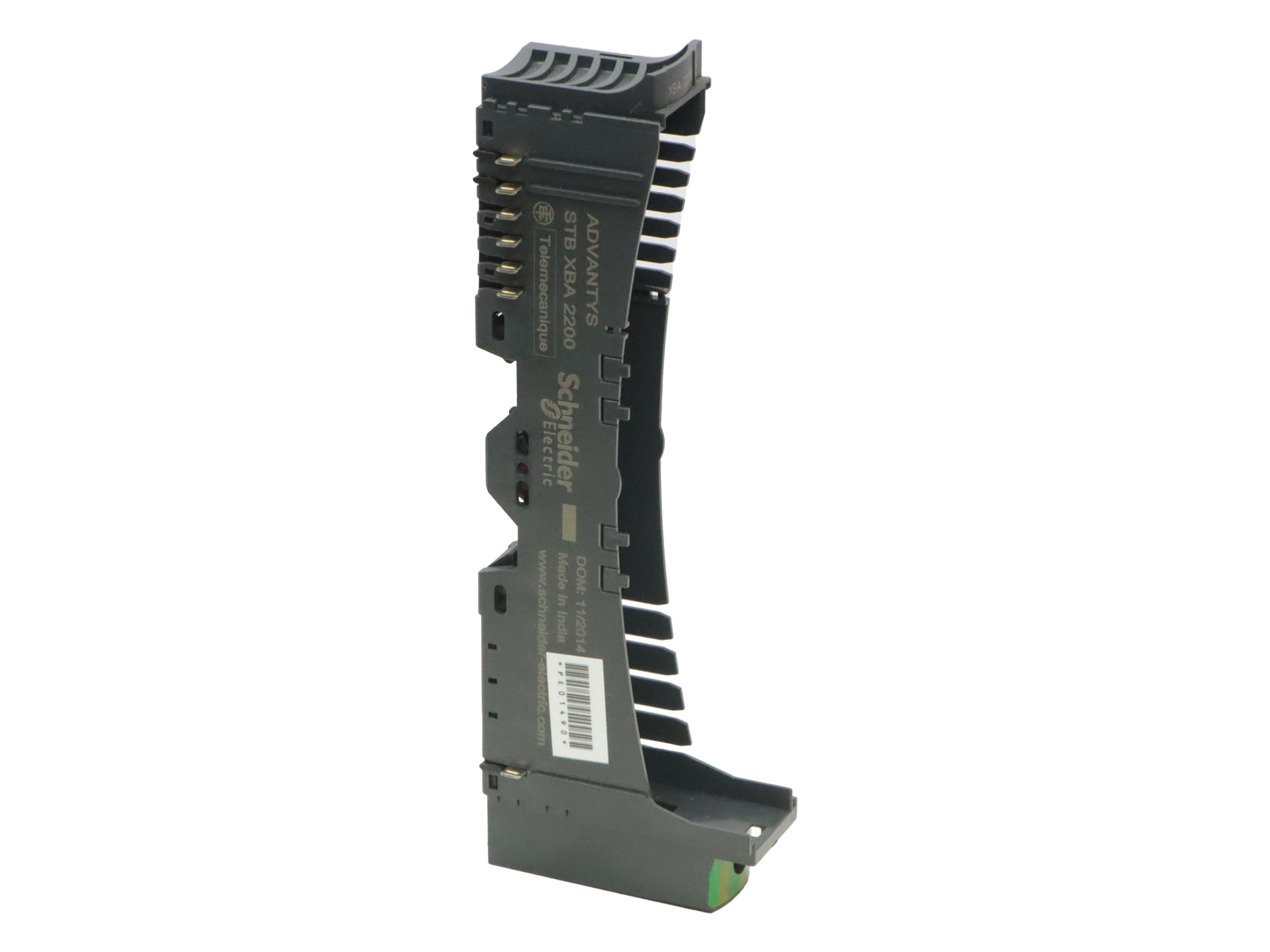 STBXBA2200 de la gamme Advantys STB. Il s'agit d'un bâti de montage conçu pour les modules de distribution électrique, offrant une solution compacte et légère avec une largeur de 18,4 mm et un poids de 0,035 kg, idéale pour les installations industrielles. Ce produit est compatible avec une variété d'accessoires, notamment les références STBPDT3100, STBPDT3105, STBPDT2100 et STBPDT2105, et est conçu pour être fixé sur un rail DIN, facilitant son intégration dans des armoires électriques ou des tableaux de commande. Le STBXBA2200 est conforme à la régulation REACh, attestant qu'il ne contient pas de substances extrêmement préoccupantes (SVHC). Il respecte aussi la directive RoHS de l'Union Européenne et la régulation RoHS de la Chine, qui imposent des restrictions sur l'utilisation de certaines substances dangereuses. Le STBXBA2200 est idéal pour des applications dans des systèmes d'automatisation industrielle, où une distribution électrique fiable et une intégration facile des modules d'E/S sont essentielles, comme dans les chaînes de production automatisées ou les systèmes de contrôle de processus.