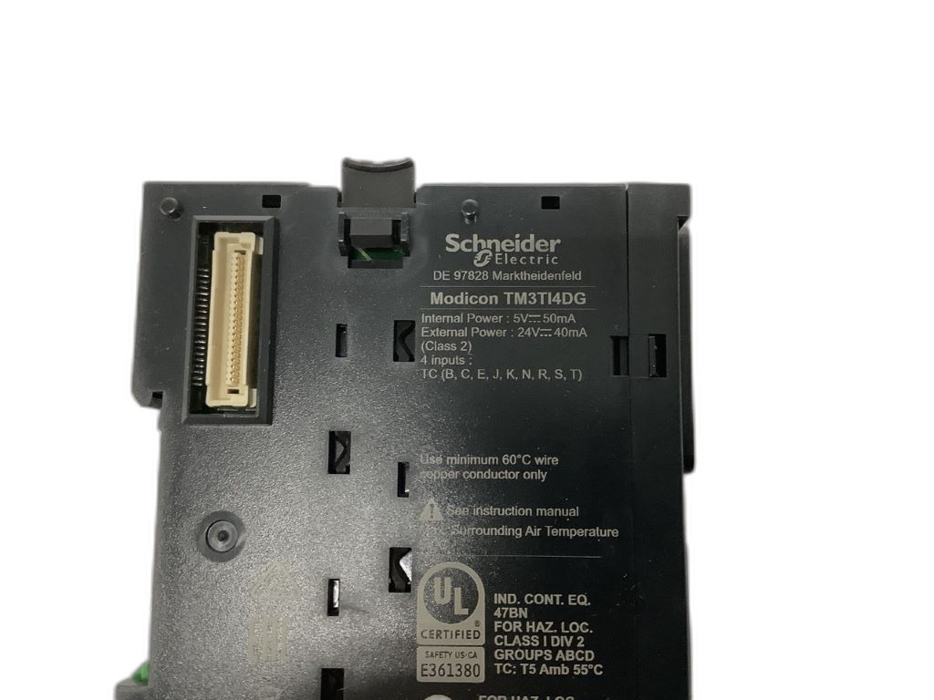 Le module TM3TI4DG de la gamme Modicon TM3 est un module d'entrées analogiques conçu pour la mesure de température via des thermocouples, compatible avec les automates Modicon M221, M241, M251 et M262. Il dispose de 4 entrées analogiques pour thermocouples, avec une plage de mesure allant de -200 °C à 2315 °C, en fonction du type de thermocouple utilisé (J, K, R, S, B, T, N, E, C).