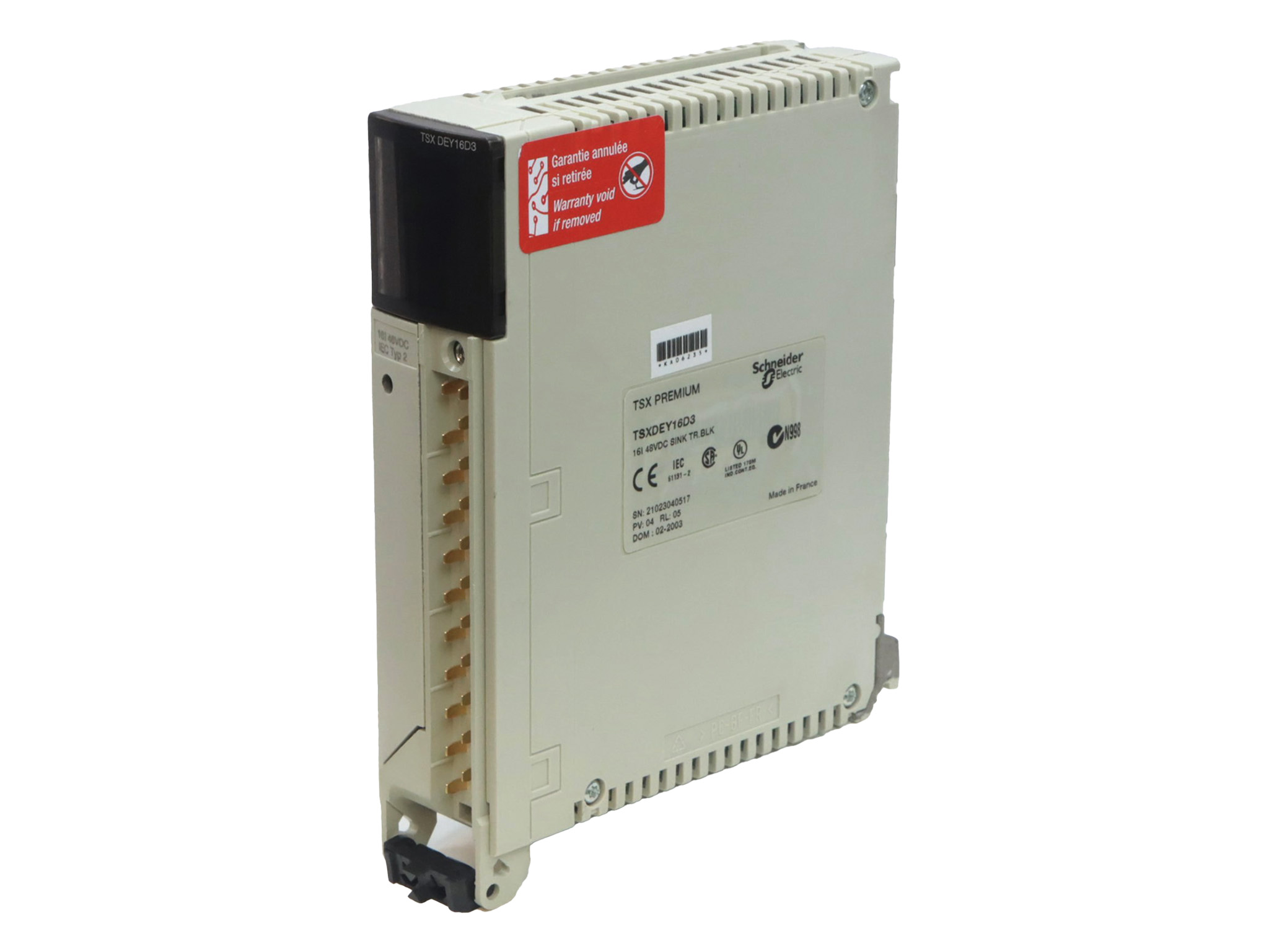 TSXDEY16D3 de la gamme Modicon Premium de Schneider Electric. Ce module d'entrées numériques est spécialement conçu pour gérer 16 entrées de type tout ou rien (TOR) avec une tension d'entrée de 48 V CC positif. Il est compatible avec des détecteurs de proximité à 2 ou 3 fils, conformément à la norme EN/CEI 60947-5-2. Chaque entrée TOR a une consommation de courant de 7 mA, et le module assure une tension d'état 1 supérieure ou égale à 30 V avec un courant d'état 1 supérieur ou égal à 6,5 mA. Pour l'état 0, la tension est inférieure ou égale à 10 V avec un courant inférieur ou égale à 2 mA. L'impédance d'entrée est de 7000 Ohm à phase 1, et le temps de réponse est inférieur ou égal à 7 ms, avec une précision de 4 ms. Le module dispose d'un bornier à vis pour le raccordement électrique et est marqué CE. Sa consommation électrique est de 135 mA à 24 V CC et de 80 mA à 5 V CC. Le produit est conforme à la norme CSA C22.2 No 213 Classe I Division 2 Groupes A, B, C, D, UL 508, EN/CEI 61131-2, ainsi qu'aux directives européennes 73/23/EEC, 93/68/EEC, 92/31/EEC, et 89/336/EEC. Il est également certifié par des organismes maritimes tels que DNV, GL, RINA, BV, LR, ABS, et RMRS. Le module TSXDEY16D3 résiste à une tension diélectrique de 1500 V CA à 50/60 Hz et peut opérer dans des conditions de 0 à 60 °C avec une humidité relative de 10 à 95 % sans condensation. Il est adapté à une utilisation jusqu'à une altitude de 2000 m et bénéficie d'un traitement de protection TC avec un degré de protection IP20.