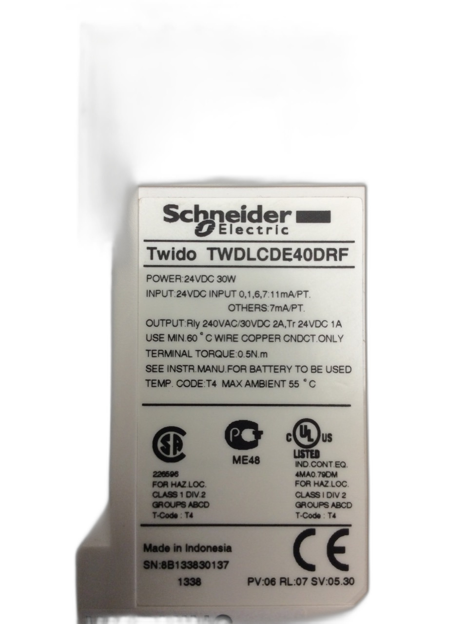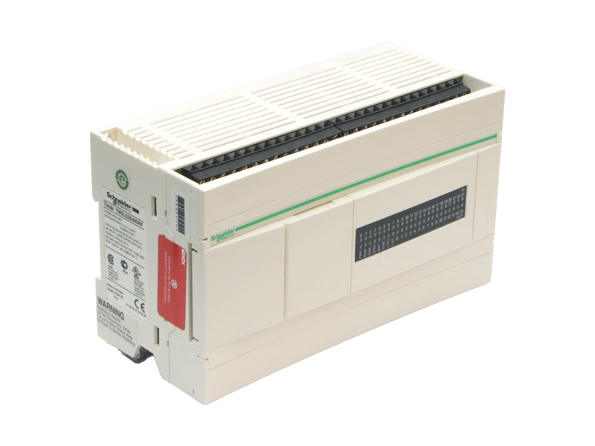 TWDLCDE40DRF Base d'automate extensible Twido Schneider Telemecanique 24 VCC 24 entrées 24E numériques 24 VCC 16 sorties 16S relais jusqu'à 40 E/S supplémentaires port RS-485 110 x 90 x 40 mm