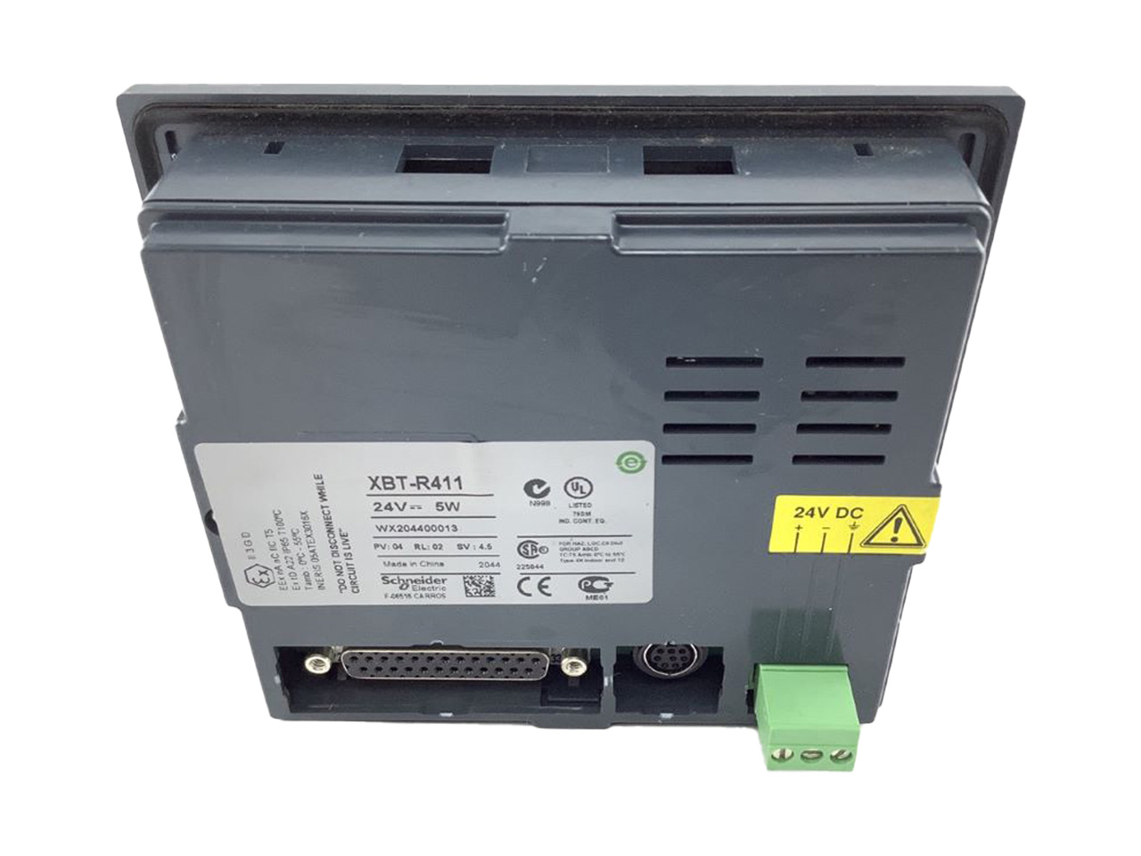 XBTR411 de la gamme Magelis XBT N/R/RT de Schneider Electric. Ce terminal est doté d'un écran LCD matriciel rétro-éclairé avec une résolution de 122x32 pixels. Il fonctionne sous une tension d'alimentation de 24 V CC, acceptant des variations de 18 à 30 V et une ondulation résiduelle jusqu'à 1200 mV. Sa consommation de puissance ne dépasse pas 5 W. Le terminal est équipé de 20 touches, dont 8 fixes et 12 personnalisables, et de 16 LEDs pour l'indication de tension. Il peut contenir jusqu'à 200 pages d'application et 256 pages d'alarme, avec une mémoire Flash de 512 Ko. Pour la connectivité, il dispose d'une liaison série (RS232C/RS485) via un port SUB-D 25 femelle, une alimentation par bornier débrochable à vis, et un port d'imprimante mini DIN femelle. Le XBTR411 est compatible avec diverses gammes d'automates, y compris Modicon Premium, Modicon M340, Twido, Modicon TSX Micro, Modicon Momentum et Modicon Quantum. Son installation se fait par montage encastré avec fixation par clips à ressort. Concernant les normes, le terminal est conforme aux exigences de la CEI 61131-2, CEI 60068-2-6, CSA C22.2 No 14, CEI 60068-2-27 et UL 508. Il est également certifié pour des environnements spécifiques comme CSA Class 1 Division 2, UL 1604, ATEX zone 2/22 et UL Class 1 Division 2.